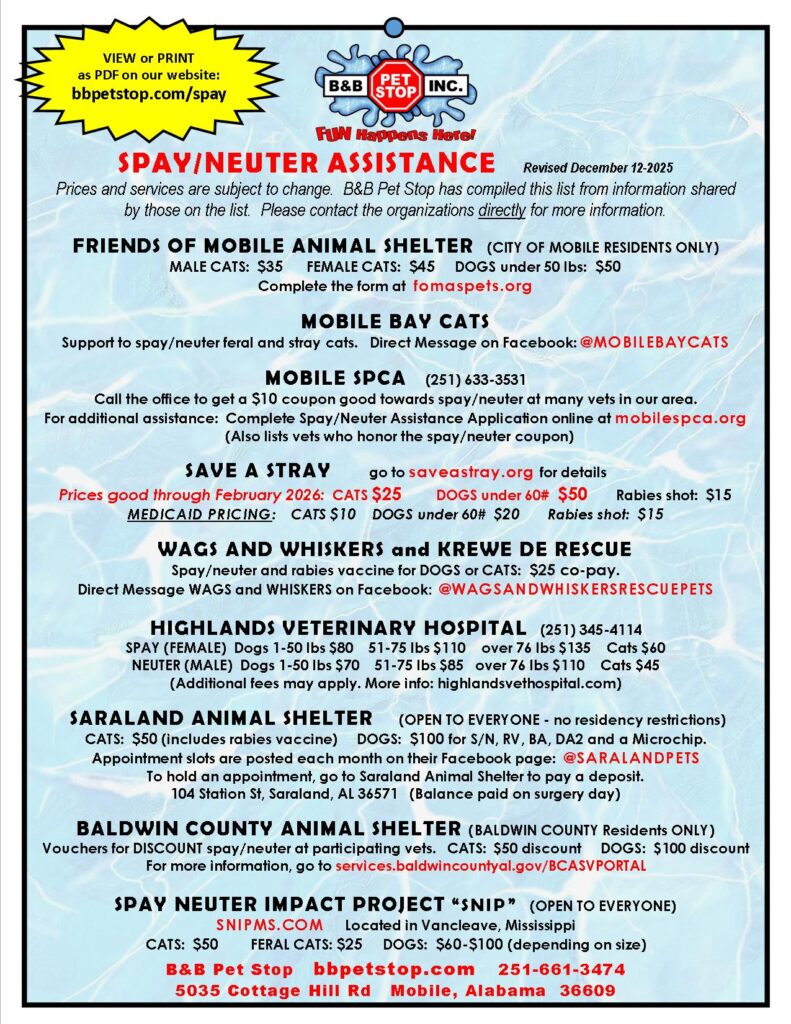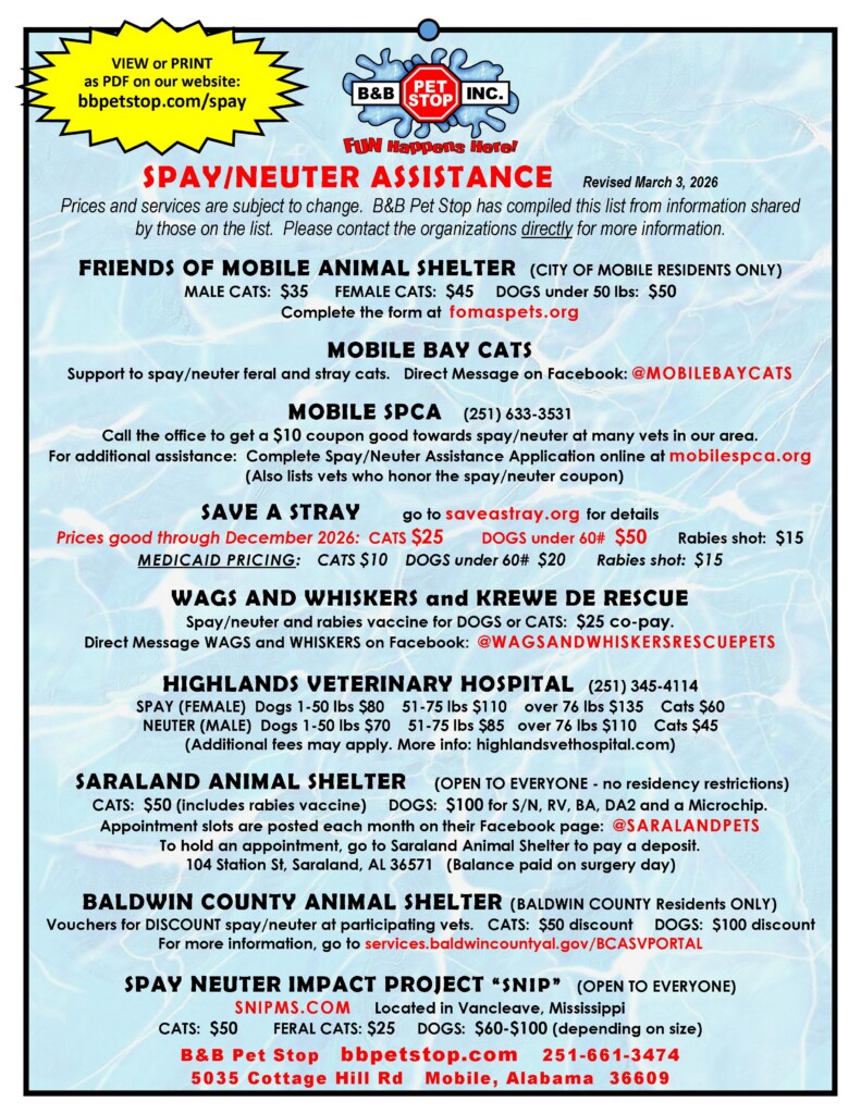 This list was compiled by B&B Pet Stop to help members of our community access affordable spay/neuter options. If you have additional resources or information to add to this document, please click here to submit a form with that information.
