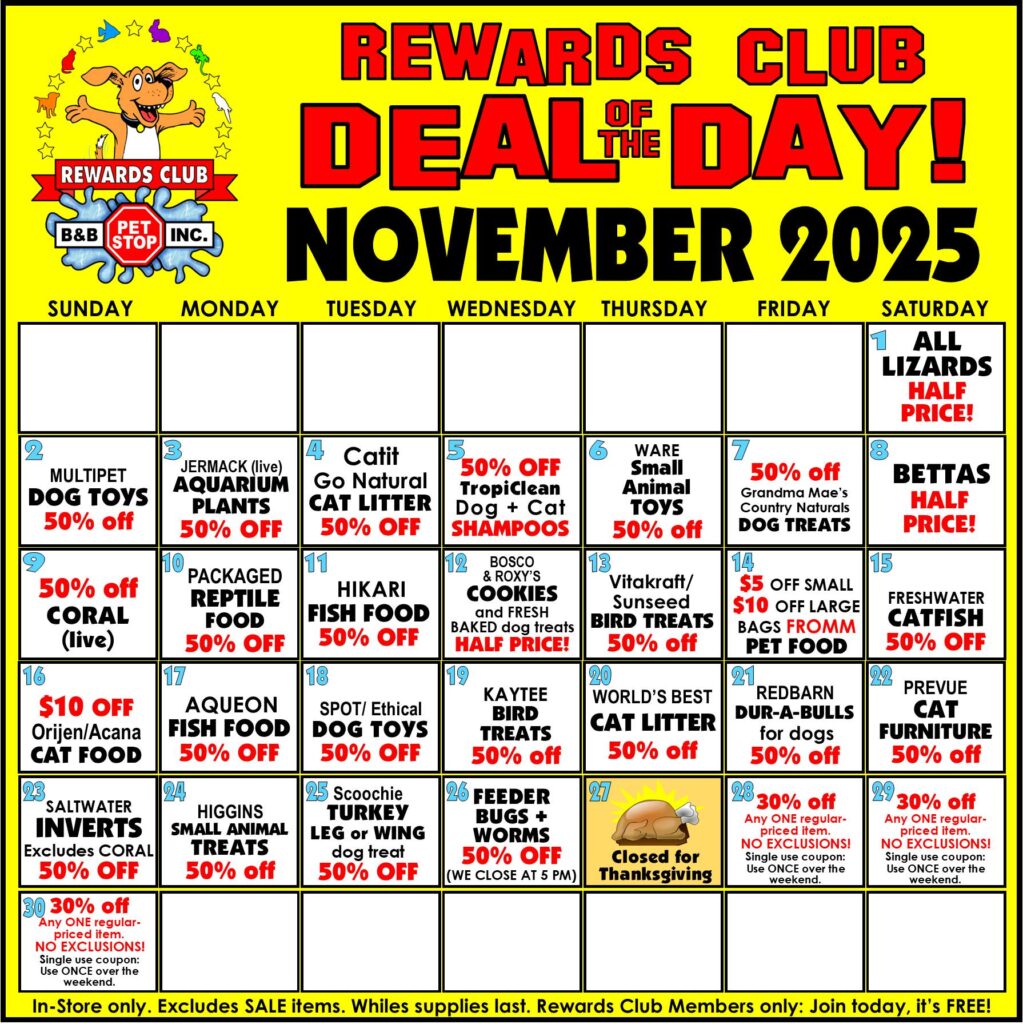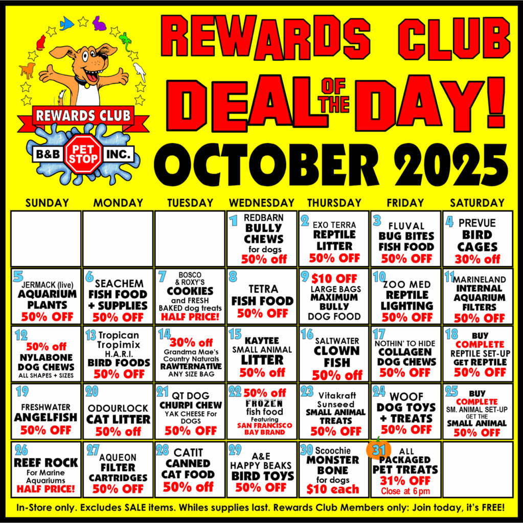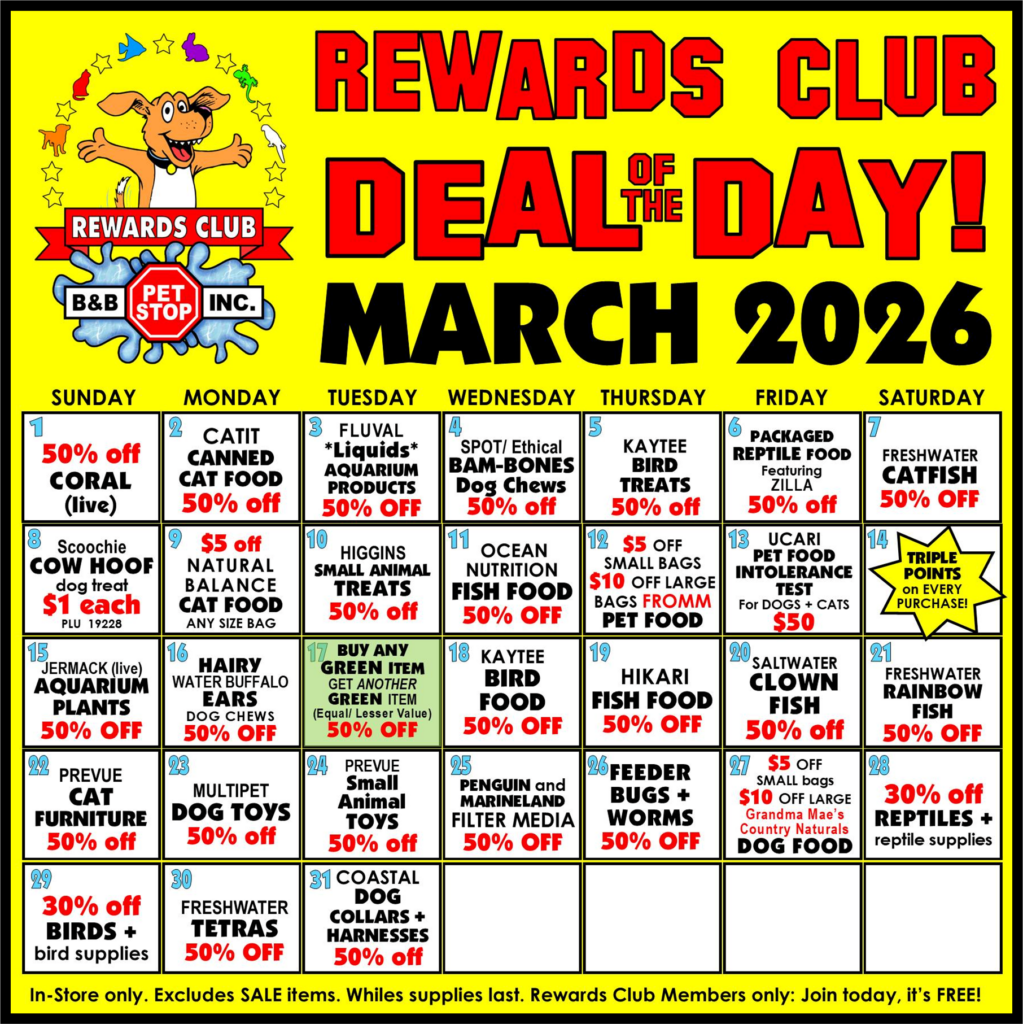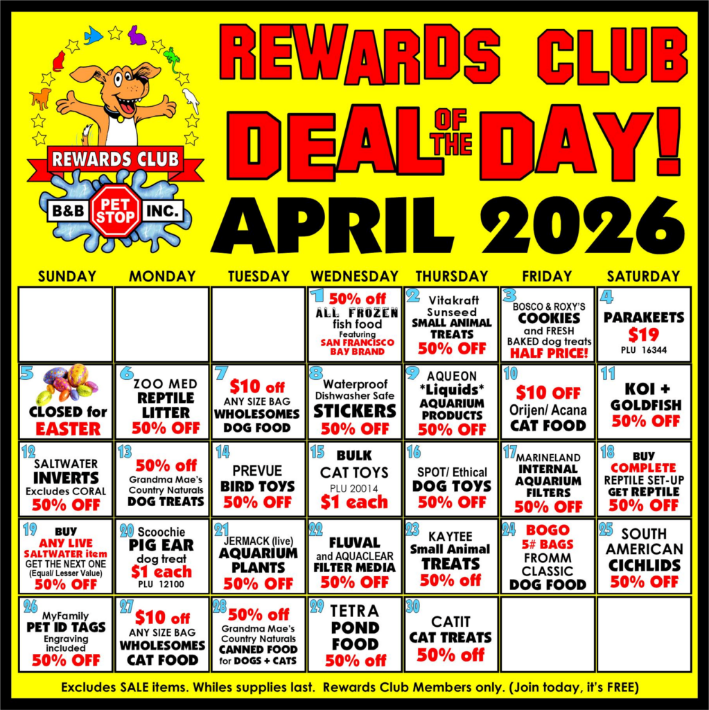 B&B Pet Stop’s Rewards Club DEAL of the DAY offers low prices on great products from across all of our pet categories. These offers are available in the store during store hours or until they’re sold out. No rainchecks.